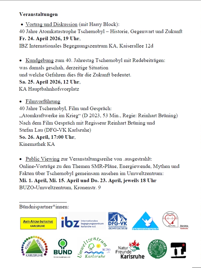 Am 26. April ist es 40 Jahre seit der Atomkatastrophe von Tschernobyl. Hierzu sind verschiedene Veranstaltungen geplant: